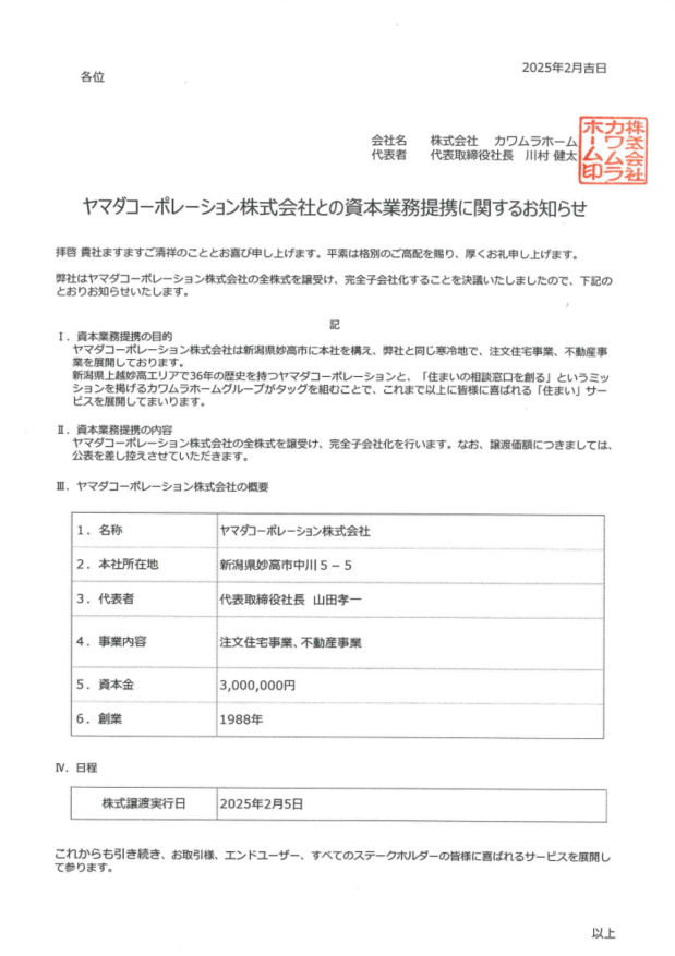 ヤマダコーポレーション株式会社との資本業務提携に関するお知らせ