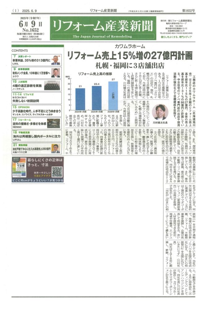 2025年6月9日号のリフォーム産業新聞にカワムラホームが掲載
